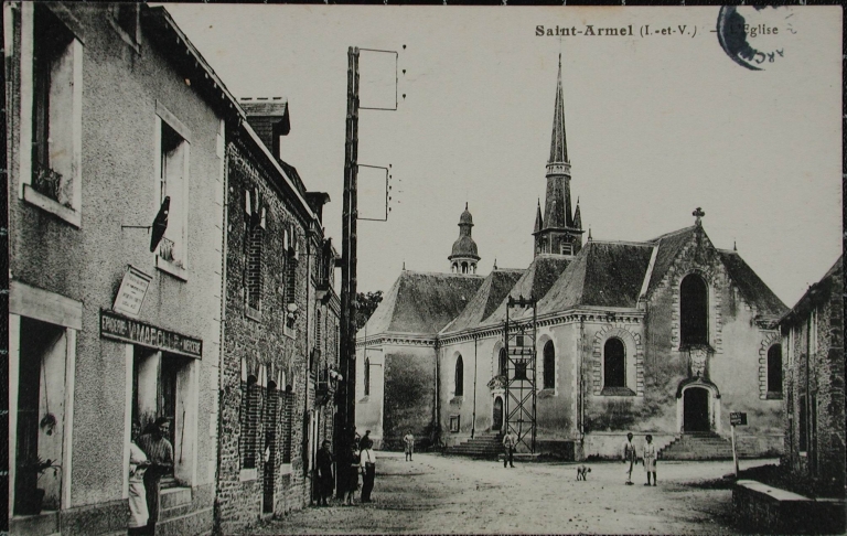 Carte postale de Saint-Armel représentant l'église et quelques maisons du bourgImmatriculation