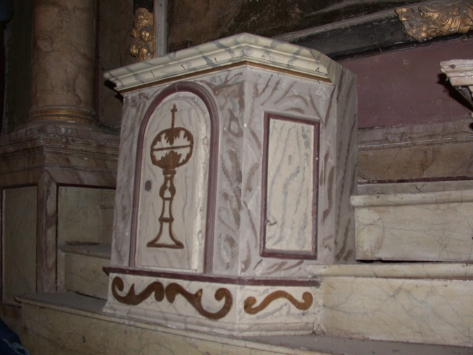 Ensemble de l'autel de la Vierge : autel, tabernacle, retable, 3 gradins d'autel, 2 degrés d'autel,