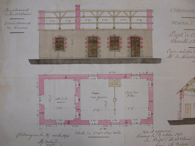 Plan et élévation de la mairie école, relevés Auguste Marchand, 1874Immatriculation