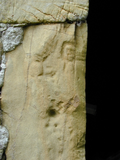 Détail du jambage d'une porte : tête de personnage sculptée ?Immatriculation