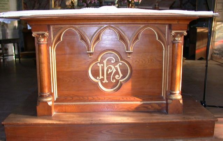 Ensemble de l'autel face aux fidèles : autel, tabernacle, gradin d'autel, 2 socles,