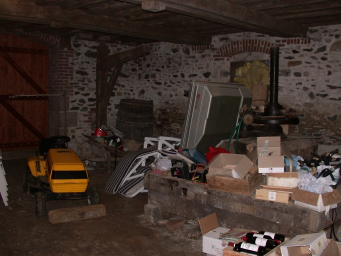 Vue intérieure, cellier avec pressoir situé à l'arrière du logisImmatriculation