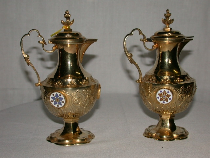 Chapelle d'orfèvrerie dans sa boîte : calice, patène, 2 burettes et leur plateau, clochette,