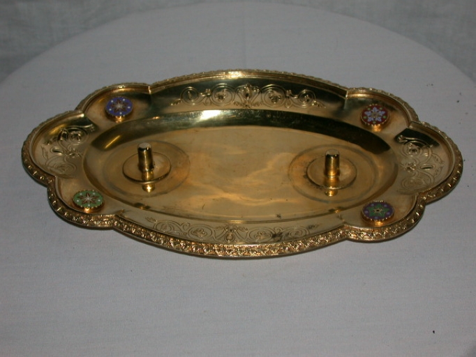 Chapelle d'orfèvrerie dans sa boîte : calice, patène, 2 burettes et leur plateau, clochette,