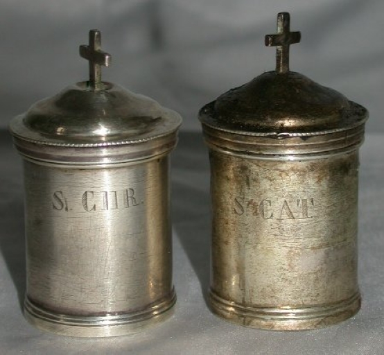 Ampoule à saint Chrême et ampoule à huile des catéchumènes,