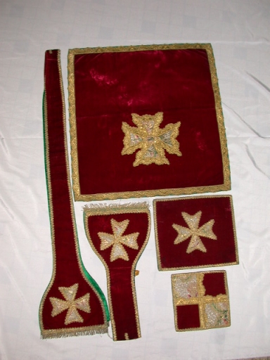 Ornement rouge 1 : chasuble, bourse de corporal, étole, manipule, pale, voile de calice,