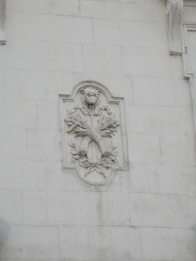 Décoration sur le mur pignon représentant une gueule de lion avec deux gerbes de blésImmatriculation