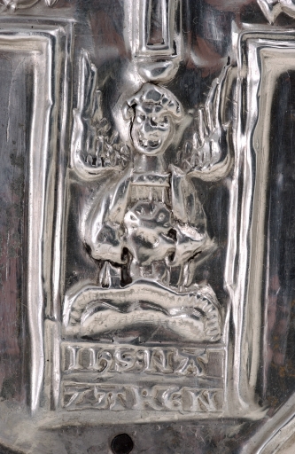 Reliquaire, revers : ange (supérieur) tenant la couronne d'épines (état en 2004)Immatriculation