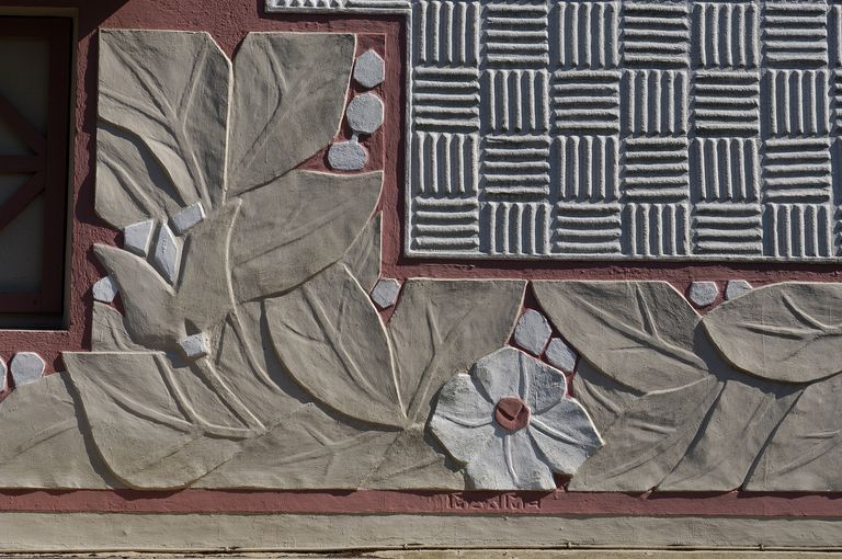 Elévation antérieure, détail de la frise avec signature du constructeur.Immatriculation