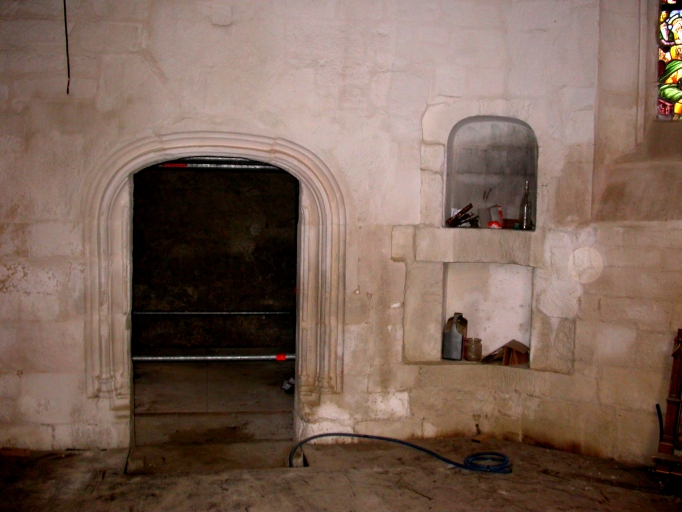 Vue intérieure : porte de la sacristie et crédence du choeur (buchée au 19e siècle)Immatriculation