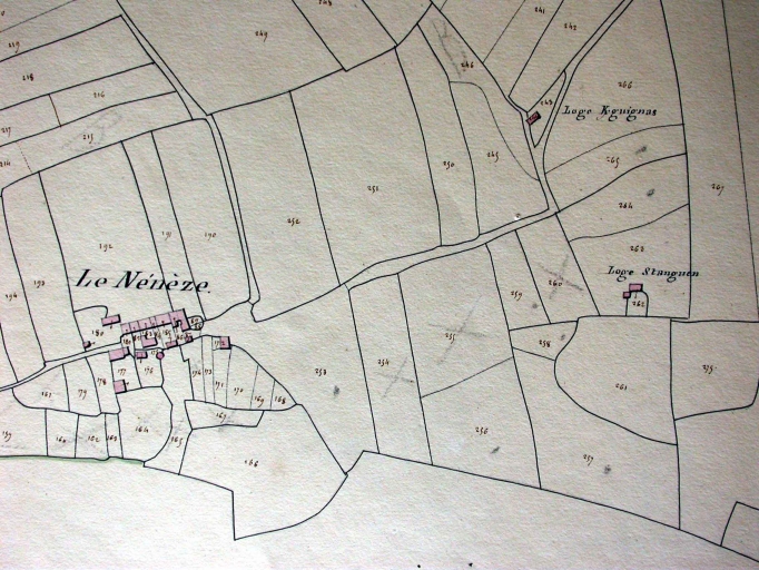 Plan cadastral 1828, section B1, vue générale du village er de Loge Kerguignas et Loge Stanguen (Doc. AD Morbihan, 3P)Immatriculation