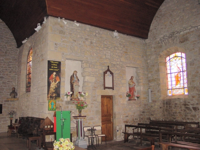 Vue intérieure ouest-est vers le transept sud. Armes de Talhouët dans la maçonnerie.Immatriculation