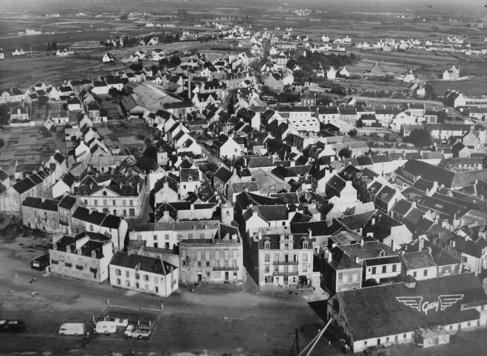 Vue aérienne l'ensemble du bourg et, au premier plan, sur la place des Thoniers. Carte postale vers 1955, éditions Gaby. Collection particulière.Immatriculation
