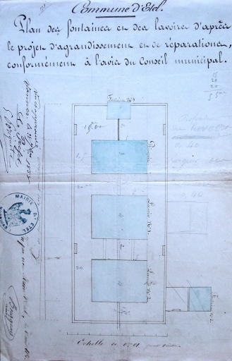 Plan du projet d'agrandissement de la fontaine lavoir du bourg, en 1858. (AD Morbihan, 3 Es 55/28)Immatriculation