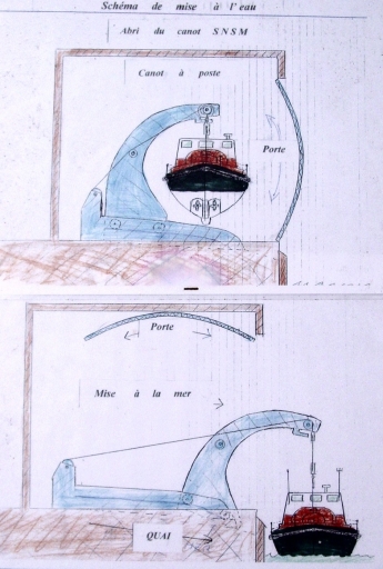 Schéma de mise à l'eau du canot de sauvetage, extrait de l'exposition en place dans l'abri.Immatriculation