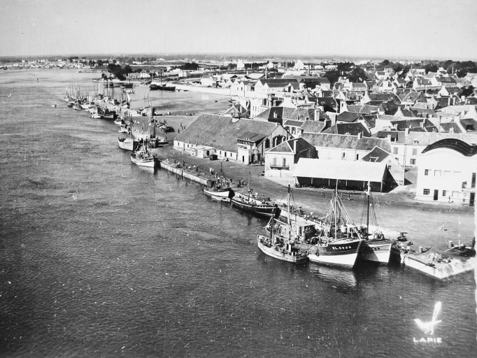 Carte postale vers 1960. La criée vue du sud-ouest. A noter les lucarnes qui éclairent les salles de classe de l'étage, aménagées dans la partie sud.Immatriculation