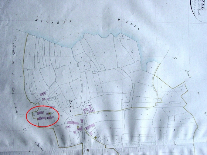 Plan cadastral de la commune d'Erdeven en 1850, section A, extrait et localisation ferme repérée.Immatriculation
