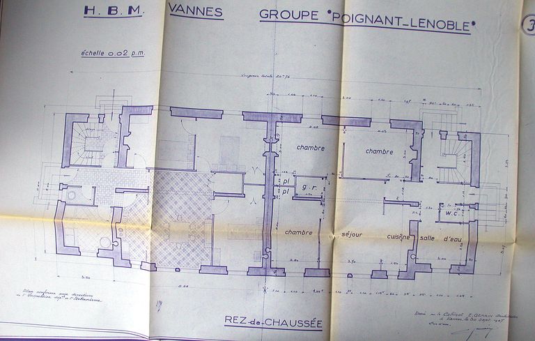 Groupe Poignant Lenoble, plan du rez-de-chaussée, signé E. Gemain, 30 septembre 1947. Doc. OPHLM, Vannes.Immatriculation