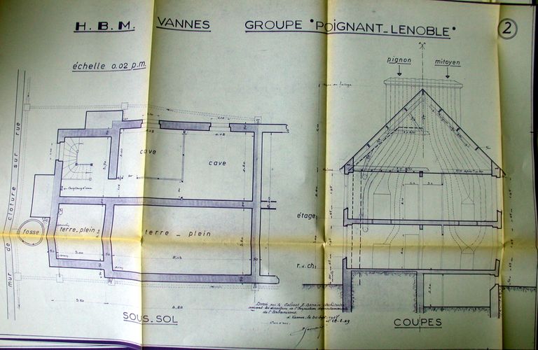 Groupe Poignant Lenoble, plans du sous-sol et coupe, signés E. Gemain, 30 septembre 1947. Doc. OPHLM, Vannes.Immatriculation