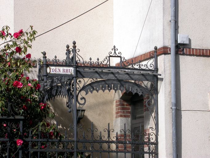 Détail de l'entrée, marquise en fer forgé et zinc.Immatriculation