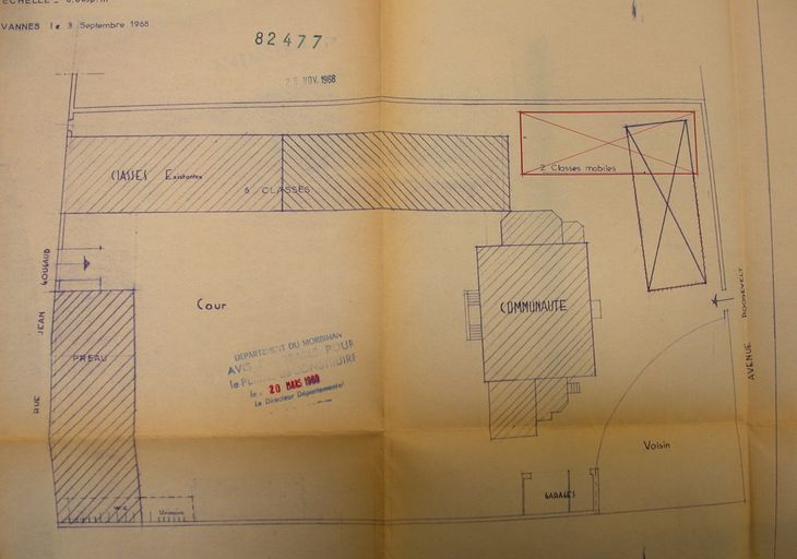 Plan de l'école dressé pour la création de 2 classes mobiles, 1965. AM Vannes 1G59.Immatriculation