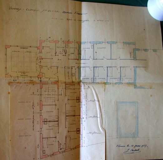 Projet d'agrandissement de la clinique Sainte-Claire : plan du rez-de-chaussée par Caubert de Cléry dressé le 12 mars 1927. AM Vannes 5 I162.Immatriculation