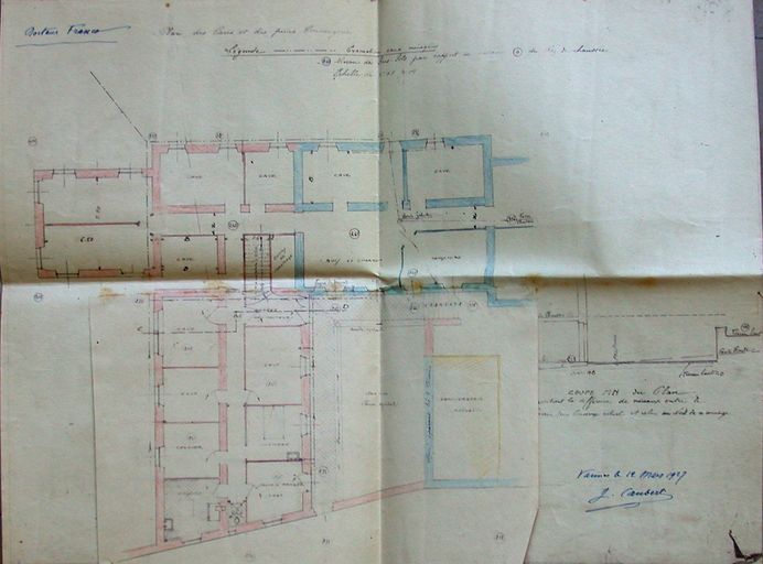 Projet d'agrandissement de la clinique Sainte-Claire : plan des caves et de la conciergerie par Caubert de Cléry dressé le 12 mars 1927. AM Vannes 5 I162.Immatriculation