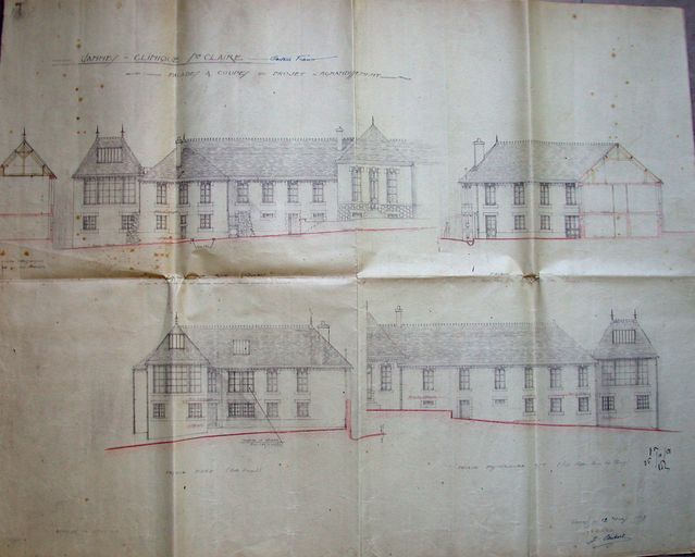 Façades et coupes du projet d'agrandissement de la clinique Sainte-Claire par Caubert de Cléry dressé le 12 mars 1927. AM Vannes 5 I162.Immatriculation