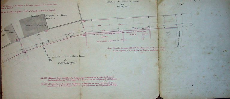 Plan parcellaire de la rue (2ème partie) dressé en 1909 mais réannoté en rouge postérieurement. AM Vannes 1O216.Immatriculation