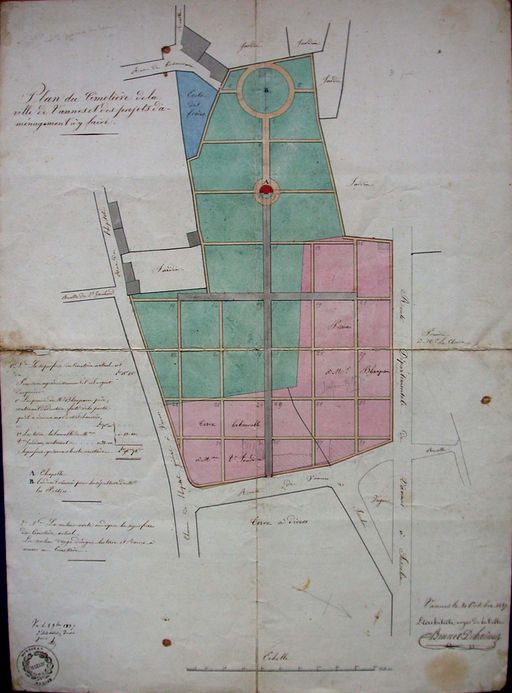 Plan du cimetière de la ville de Vannes et des projets d'aménagement à y faire 31 octobre 1837 par Brunet-Debaines. AM, Vannes 2M201.Immatriculation