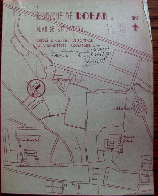 Projet d'agrandissement du bâtiment principal, par G. Caubert de Cléry, 20 février 1948. Plan de situation. AM Vannes 1G59.Immatriculation