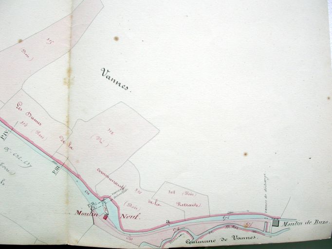 Règlement d´eau du moulin neuf sur le ruisseau de Liziec. Plan (avec figuration du moulin de Buzo), 6 juillet 1859. AD Morbihan S 1153.Immatriculation