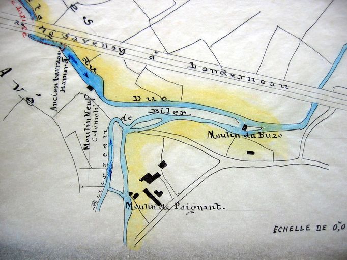 Pétition concernant le moulin du Buzo. Plan, 1897, détail. AD Morbihan S 1153.Immatriculation