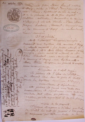 Acte notarié (recto) daté du 20 octobre 1850 : donation d'une écluse ou pêcherie au Follet (Les Hôpitaux)Immatriculation