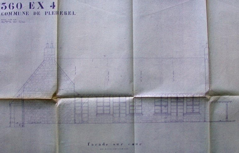 Plan de l'école artisanale et du logement de l'instituteur, élévation sur cour, 20 novembre 1936 (Pol Abraham, architecte / AD 22)Immatriculation