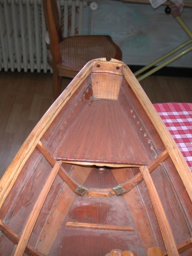 Vue de l'arrière du doris : l'écusson percé, le tollen et le mode d'assemblage des couplesImmatriculation