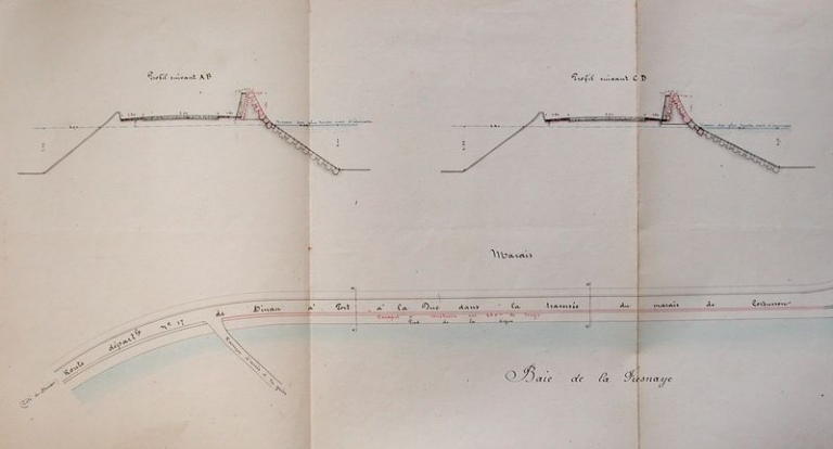 Plan et profils : construction d'un parapet sur la digue du marais de Corbusson (AD 22)Immatriculation