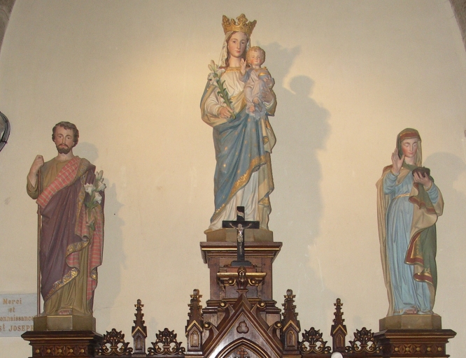 Statues du retable nord : Vierge à l'Enfant couronnée encadrée de Saint Joseph et d'une sainte à identifier, plâtre peint polychrome, 4e quart du 19e siècle. Non étudiées.Immatriculation