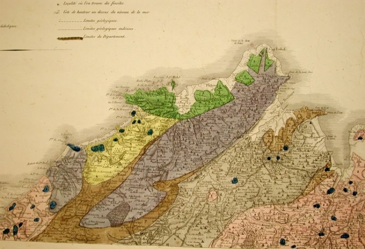 Extrait de la carte géologique des Côtes-du-Nord par Eugène de Fourcy, 1843 : le cap Fréhel (AD 22)Immatriculation