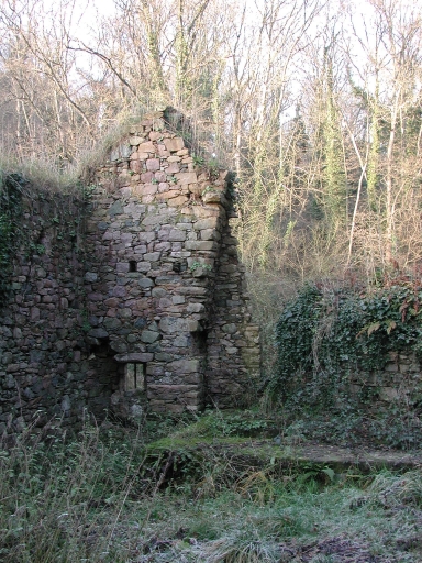 Le pigon nord en ruines et le sol dallé du moulin sous la végétationImmatriculation