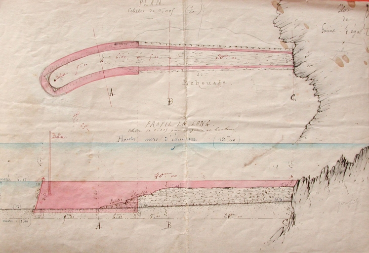 Plan en long de la nouvelle jetée de Gwin-Zégal, avant travaux, par le conducteur Cadin, 1881 (AD 22)Immatriculation