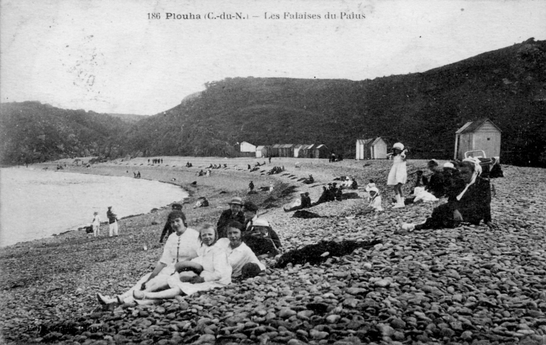 Cabanes de plage et tas de goémons à sécher sur le cordon de galets du Palus (collection particulière)Immatriculation