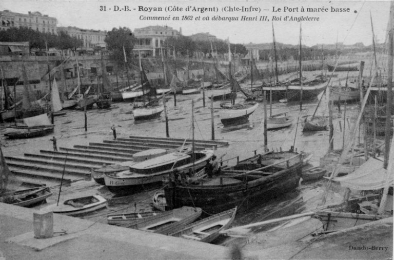 Le port de Royan à marée basse au début du 20ème siècle : amarrage traditionnel sur pieux des bateaux de pêche et de cabotage (collection particulière)Immatriculation