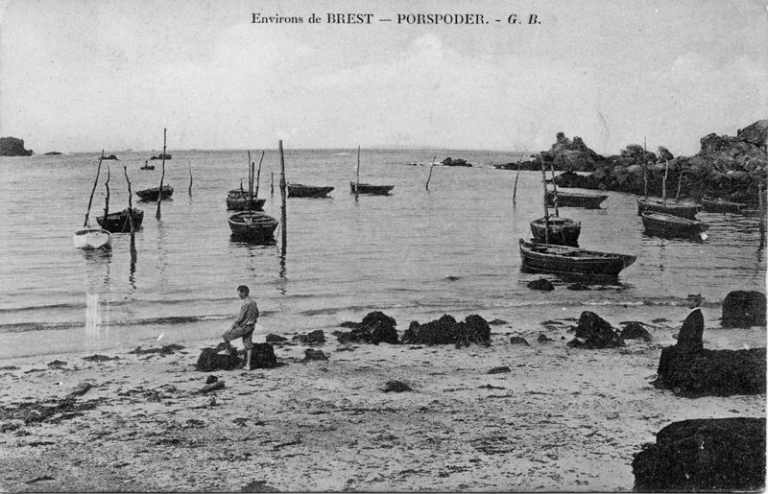 Porspoder en Finistère nord au début du 20ème siècle : amarrage traditionnel sur pieux des bateaux de pêche locaux (collection particulière)Immatriculation