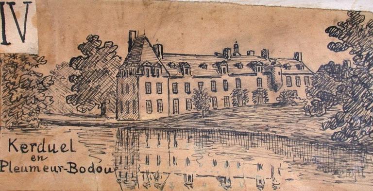 Vue générale du château de Kerduel d'après croquis réalisé par le vicomte Henri Frotier de La Messelière, 1ère moitié du 20ème siècle (AD 22)Immatriculation