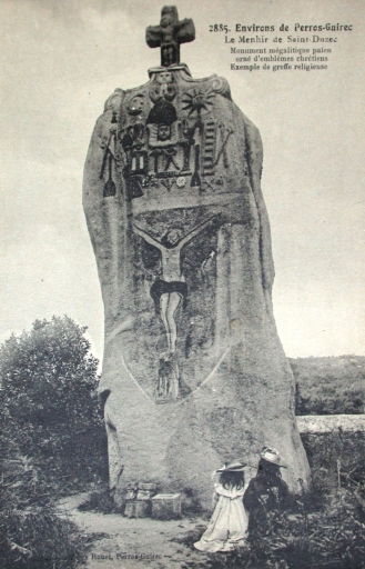 Vue générale du menhir de Saint-Uzec vers le début du 20ème siècle (Rouet, éditeur / AD 22)Immatriculation