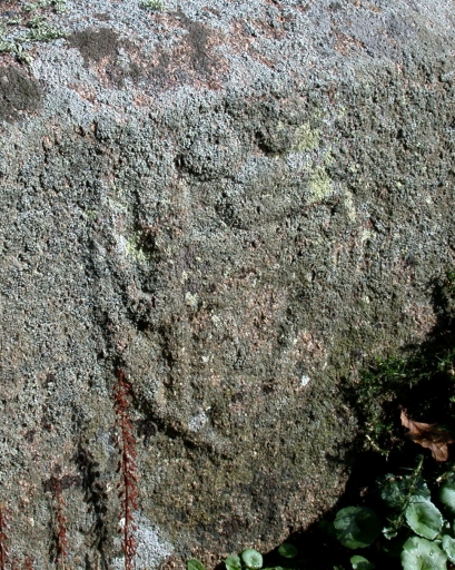 Ecu sculpté sur le socle (face) : identification probable : trois annelets et un léopard ou lion passant à la tête de face et la queue en S tournée vers l'extérieurImmatriculation