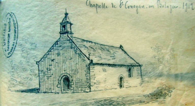 Chapelle Saint-Conogan. Dessin au crayon de Louis Le Guennec, 1912. Série 34 J 2 Fonds Le GuennecImmatriculation