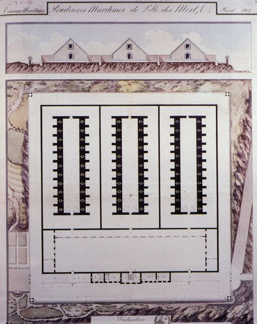 Plan et élévation des trois magasins à poudre dits "poudrières maritimes" de l'île des Morts, Travaux Maritimes, 1813Immatriculation