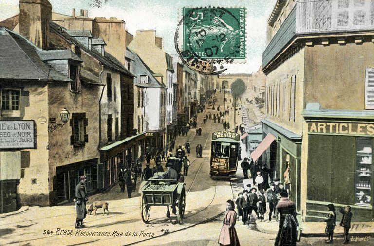 Vue du quartier de Recouvrance à Brest : rue de la porte, porte du Conquet. Carte postaleImmatriculation